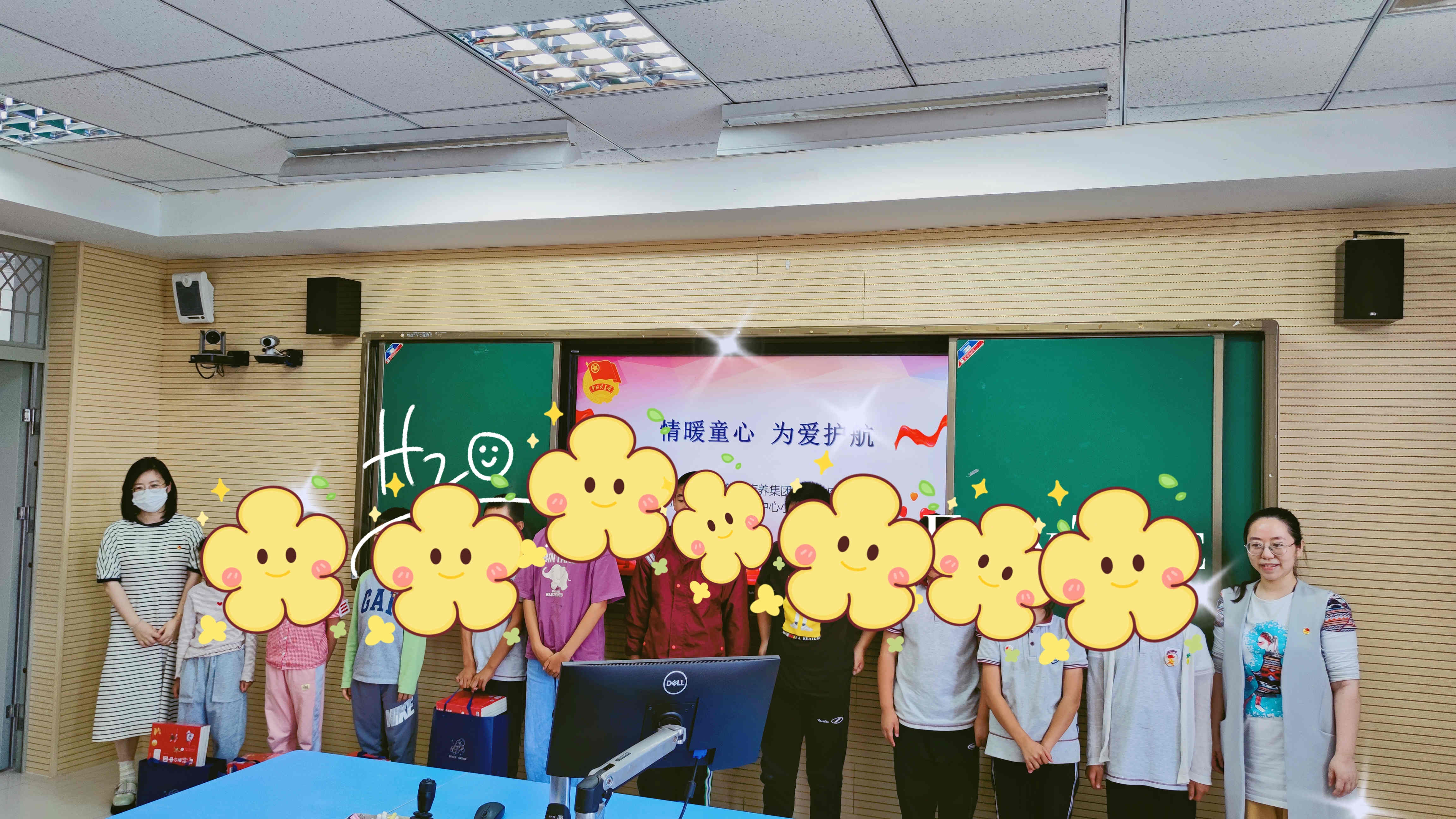 团委书记孙青、副书记陶静把为孩子们准备的文具套装和古典名著书记亲手交到小朋友手上。