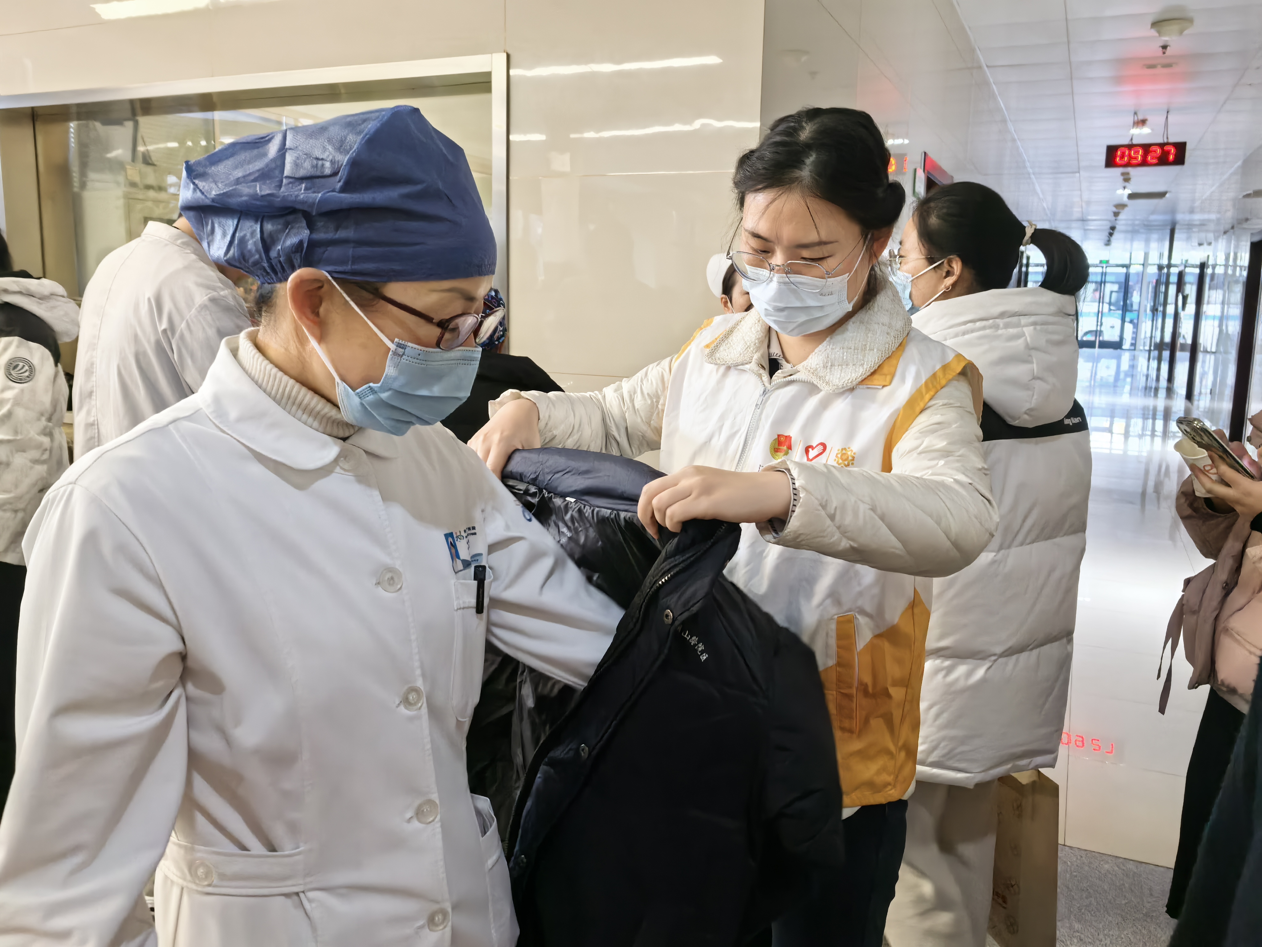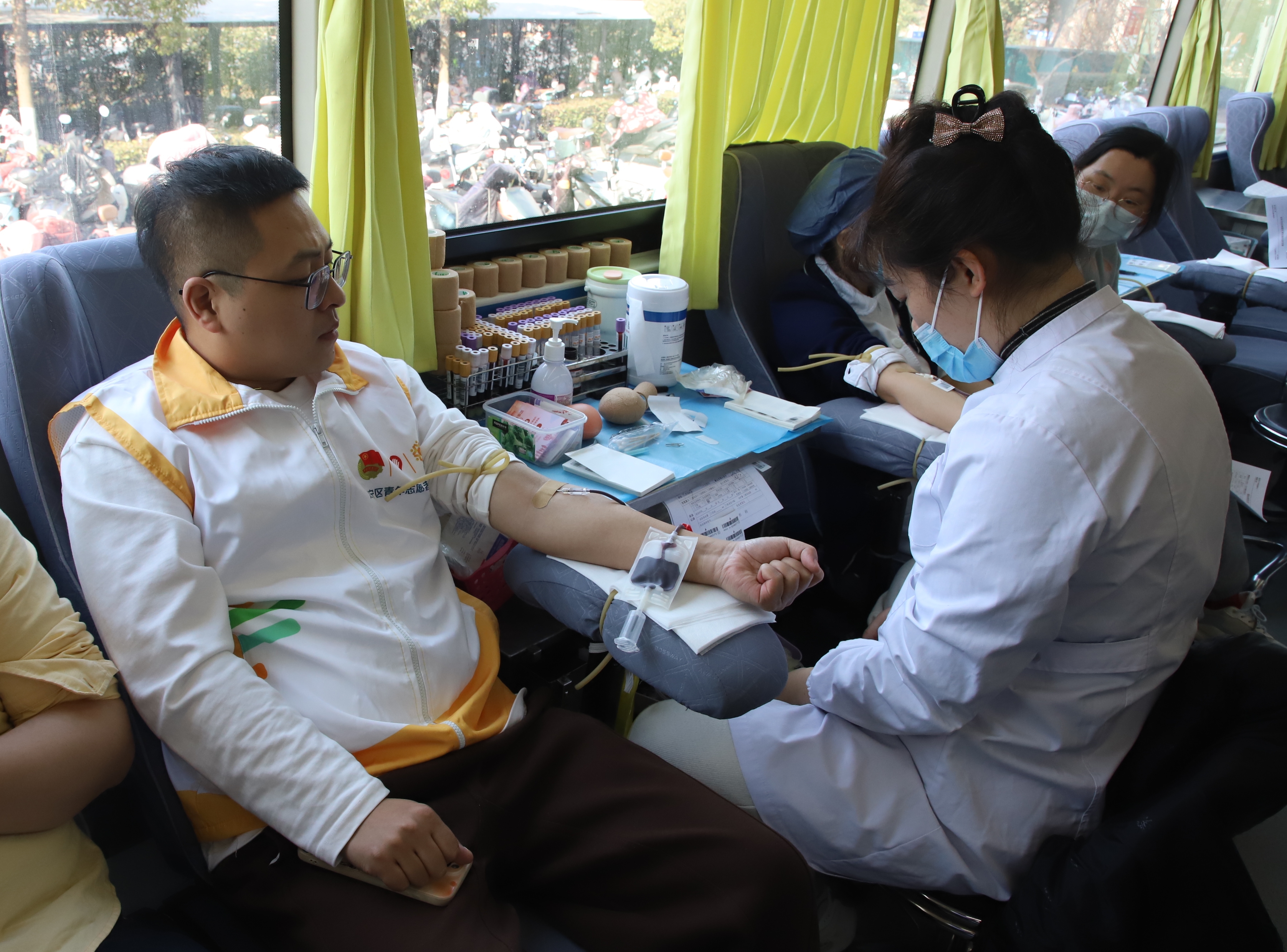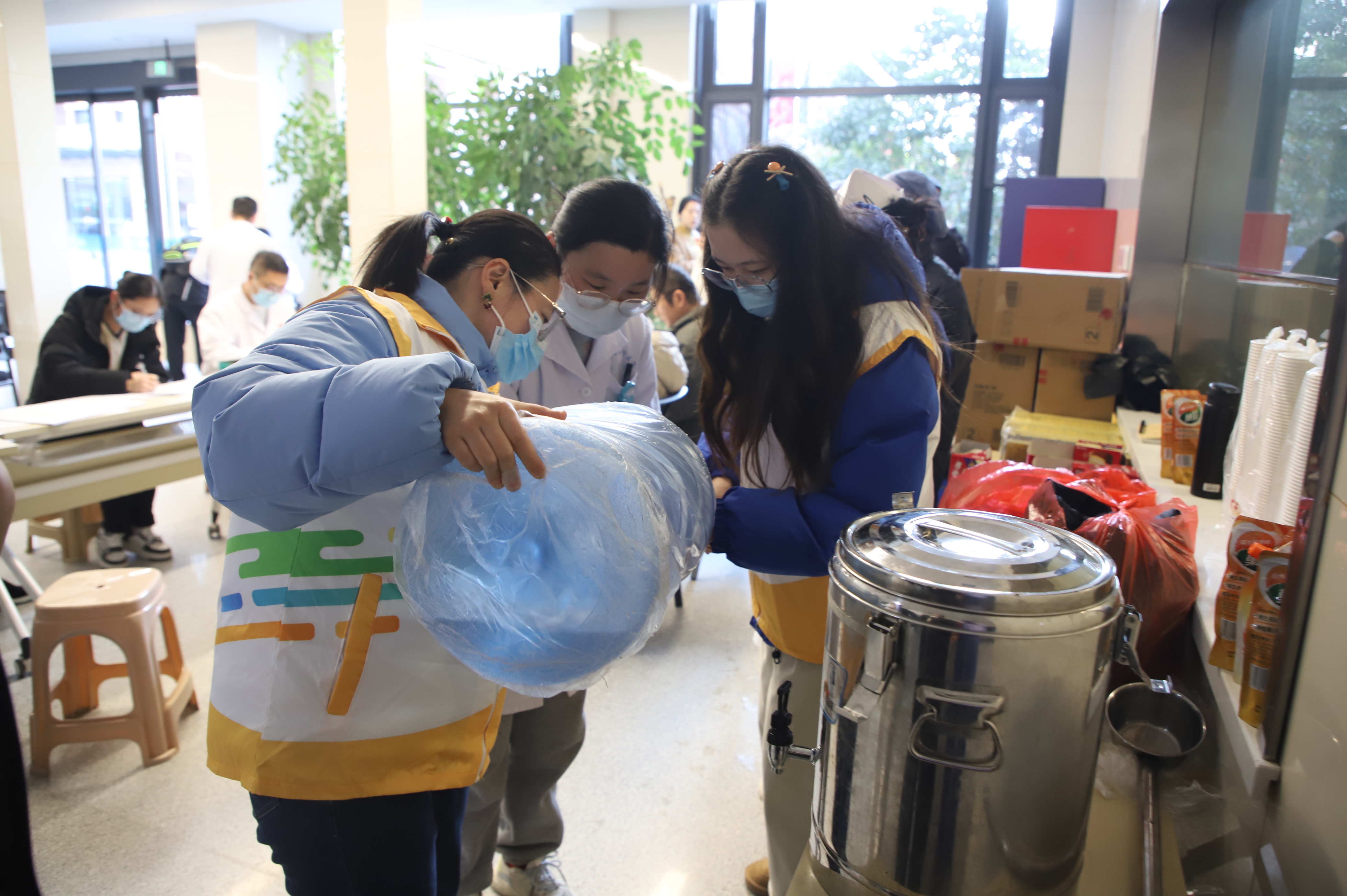 活动现场,无偿献血活动处设置了信息填报处、体检处、饮水区、献血区、领取献血证和纪念品等5个区域。院团委志愿者们耐心地为前来献血的医务工作者引导、倒水补给、披衣防寒等后勤服务,保障献血活动的顺利进行,用实际行动践行新时代青年无私奉献。
