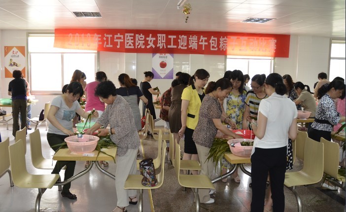 在食堂二楼举行全院女职工包粽子比赛。共有27人参加了此次活动。院领导、各支部书记、主任和部分女职工观摩了比赛,院工会主席陆丹担任裁判,院女工委主任胡晓梅主持比赛,特邀小厨娘特级白案厨师嵇师傅担任主评委。