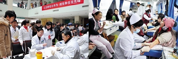 医务人员就在门诊大厅排起了长队,登记、验血,随后前往停在门诊部大楼外的献血车上依次献血。