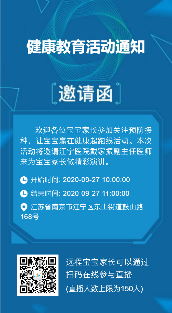 最新一期的“预防接种家长课堂(线上)”,将于2020年9月27日(周日)开课,本次家长课堂邀请熟女av 预防保健科戴家振副主任医师主讲,将与您分享为什么要接种疫苗、疫苗的分类、接种疫苗注意事项等预防接种相关知识,届时欢迎宝宝爸妈扫码参与在线听课。