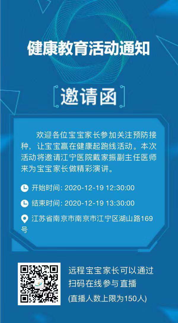 最新一期的“预防接种家长课堂(线上)”,将于2020年12月19日(周六)开课,本次家长课堂邀请熟女av 预防保健科戴家振副主任医师主讲,将与您分享为什么要接种疫苗、疫苗的分类、接种疫苗注意事项等预防接种相关知识,届时欢迎宝宝爸妈扫码参与在线听课。